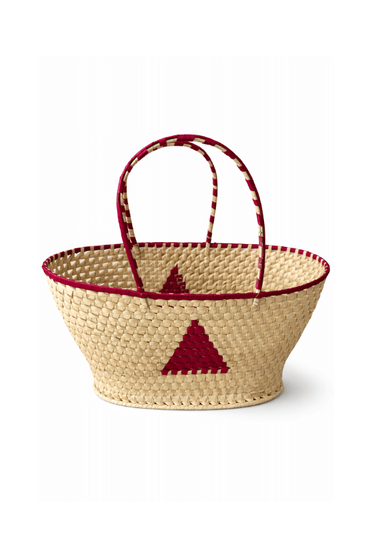 The natural woven texture is complemented by a stylish red accent design, adding a distinctive and modern touch. This makes it not only a functional item but also an attractive accessory for markets, picnics, or home storage.